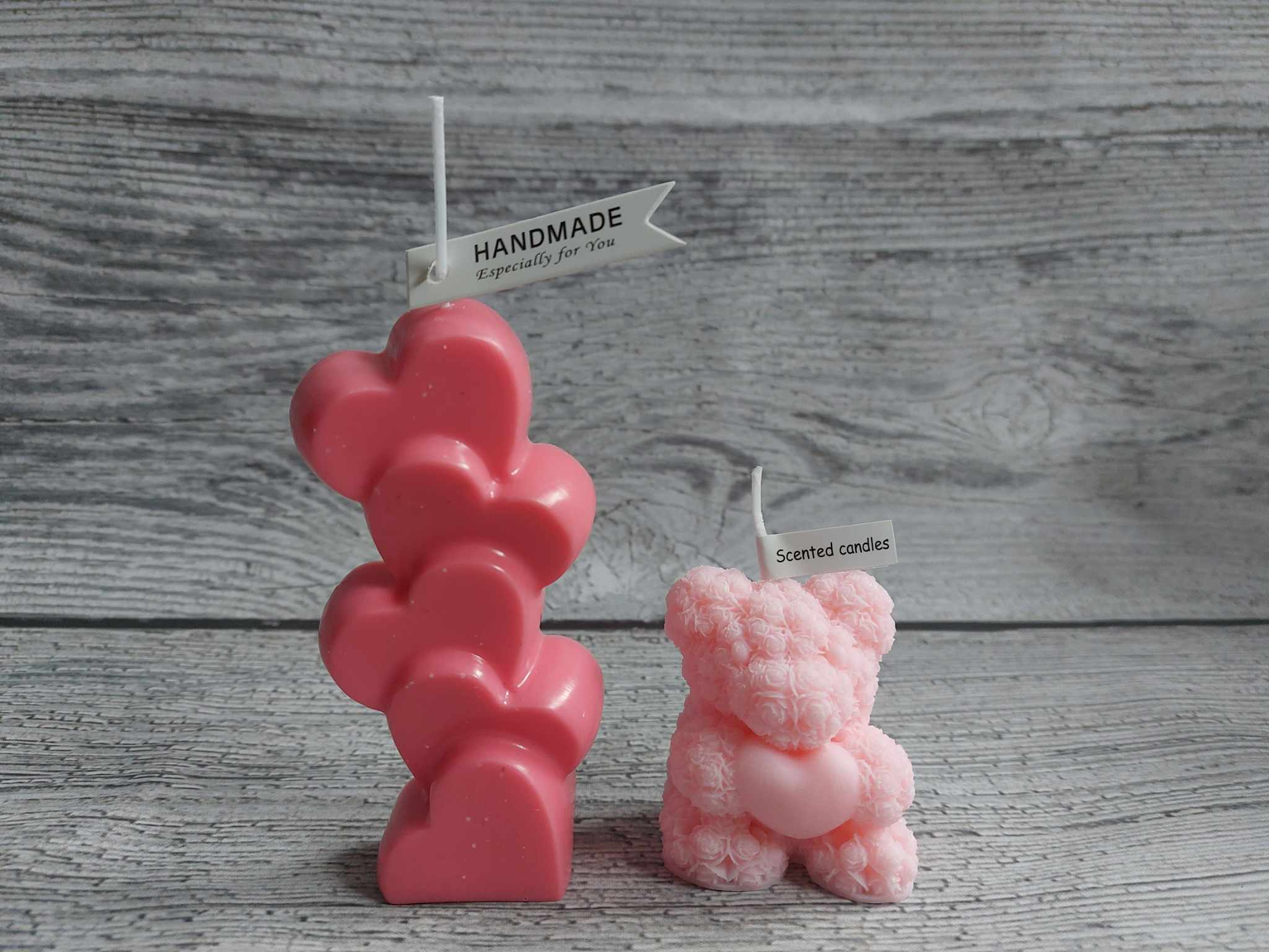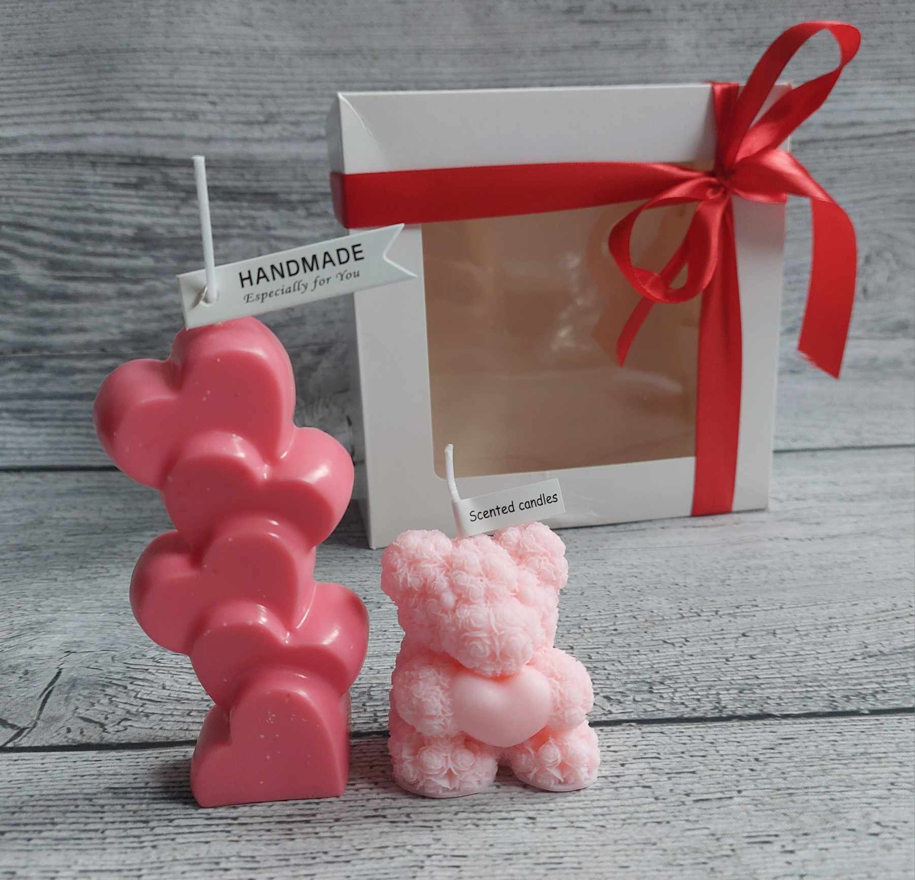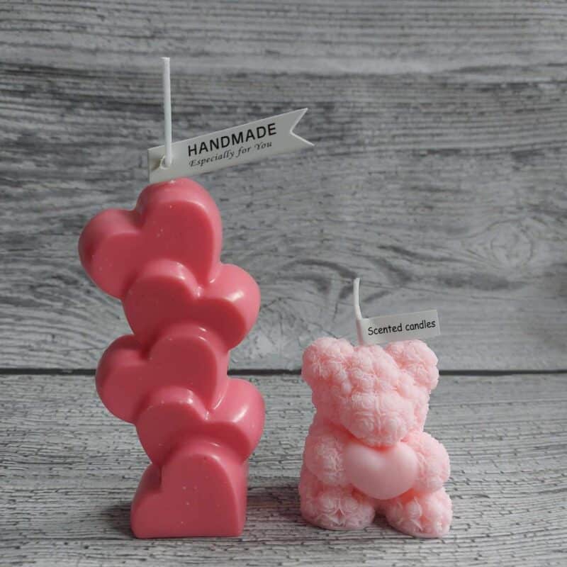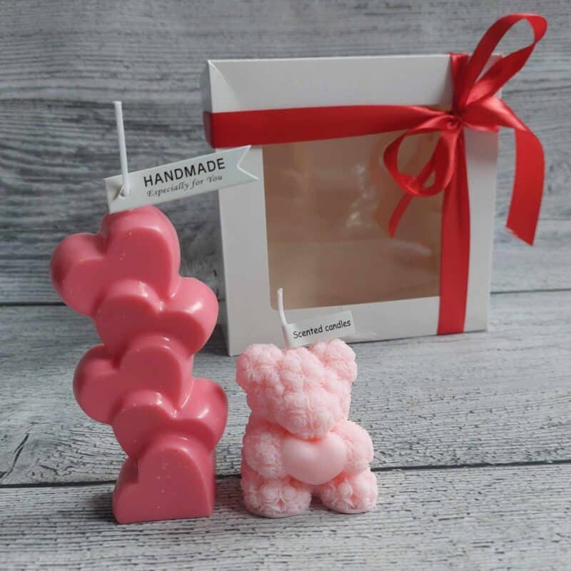 🌿Include 2 eco soy wax candles _ bear 10cm height and standing hearts 15cm height scented with flowers ( rose, peony, bergamot, freesia). safe to burn
