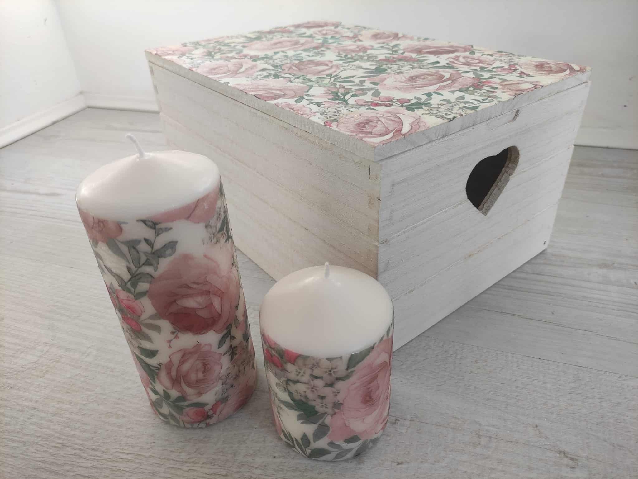 Floral roses large wooden storage box-keepsake & candles gift set