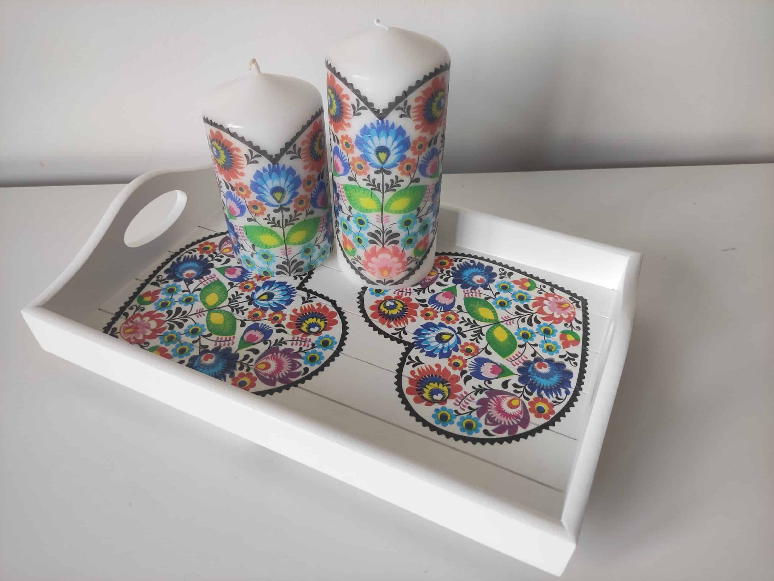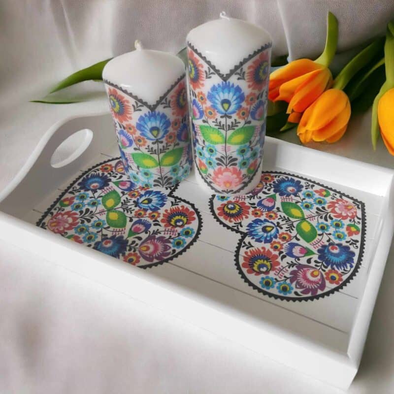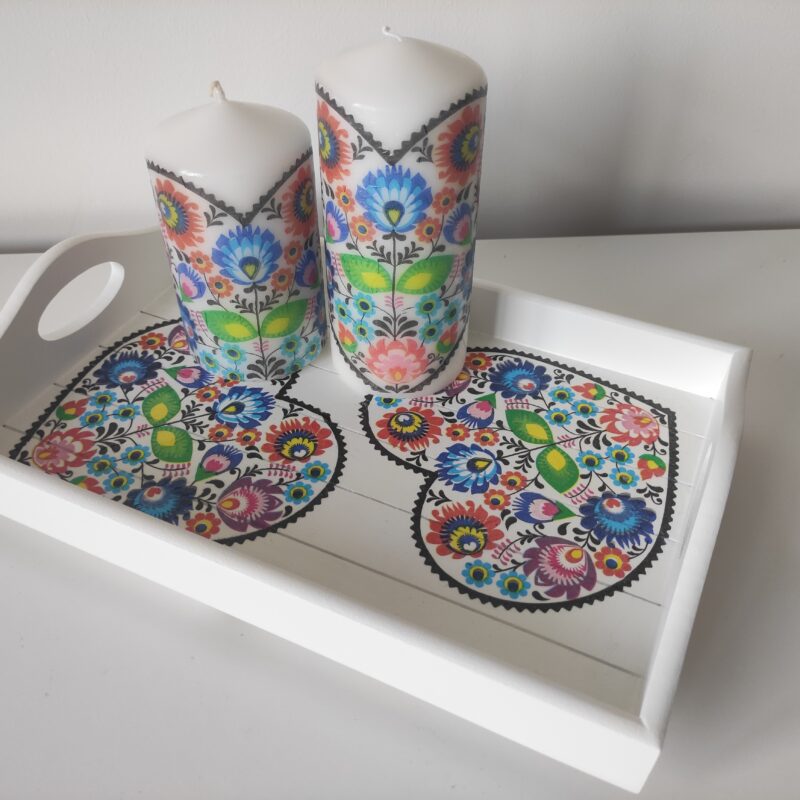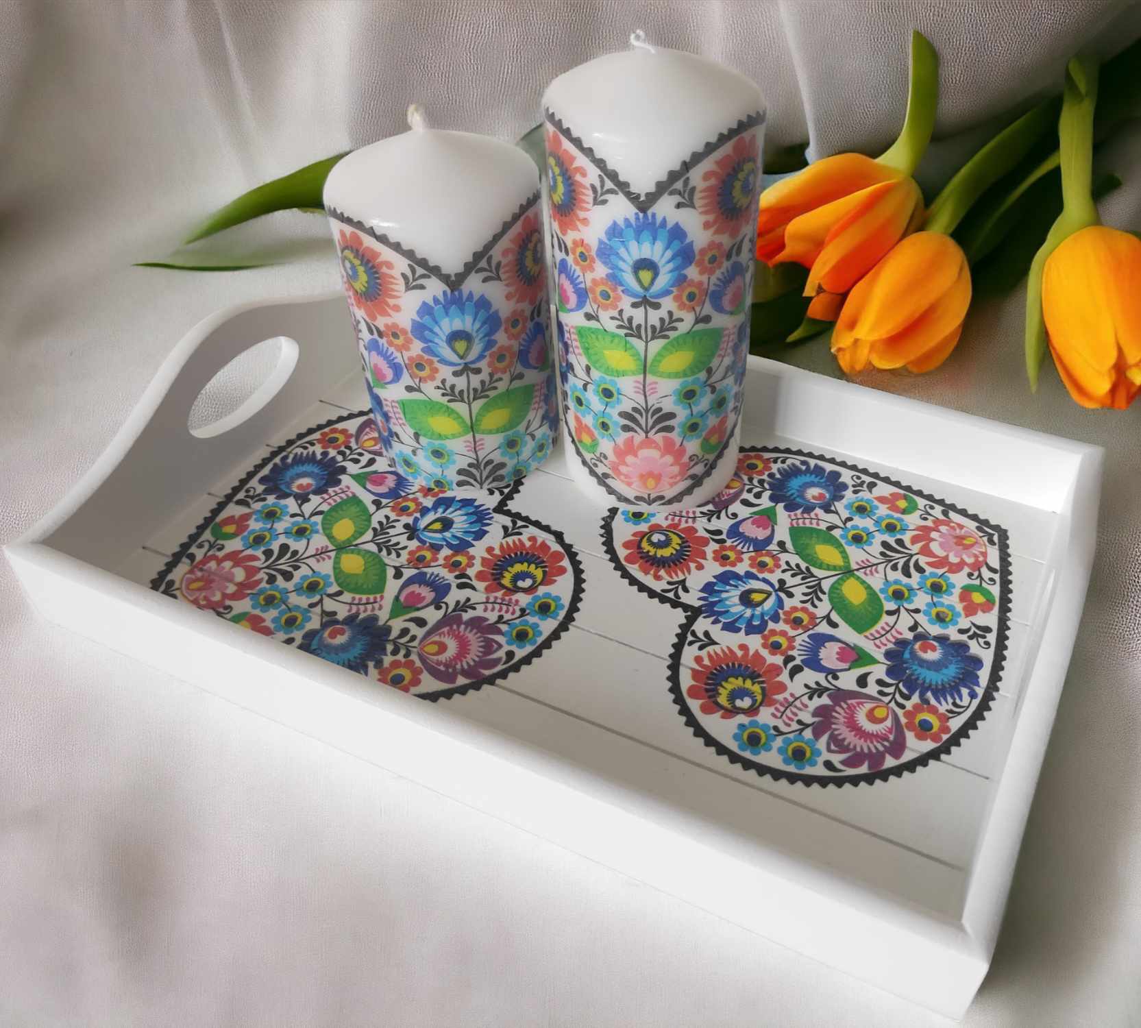 Folk floral lovely wooden tray & candles gift set