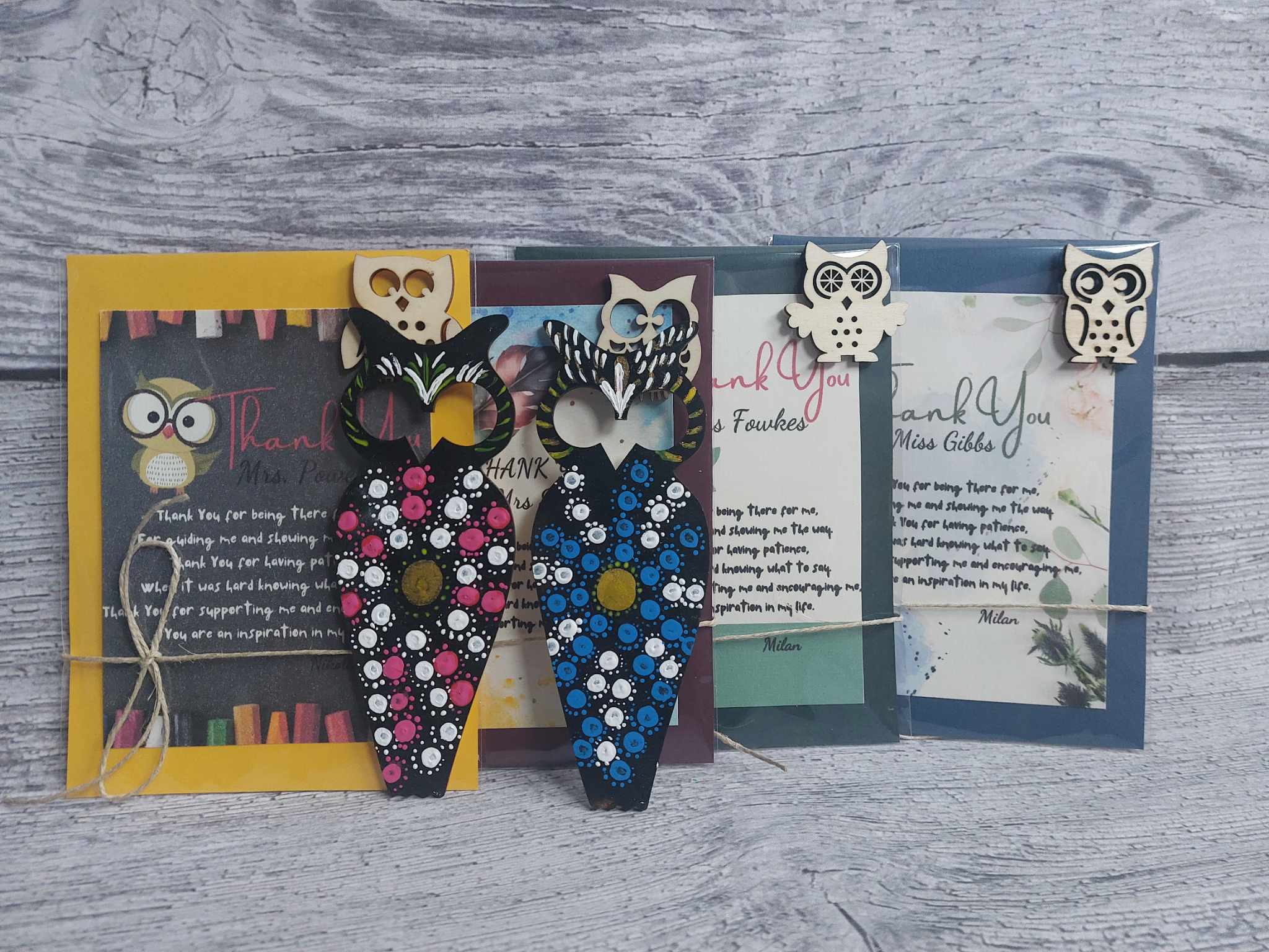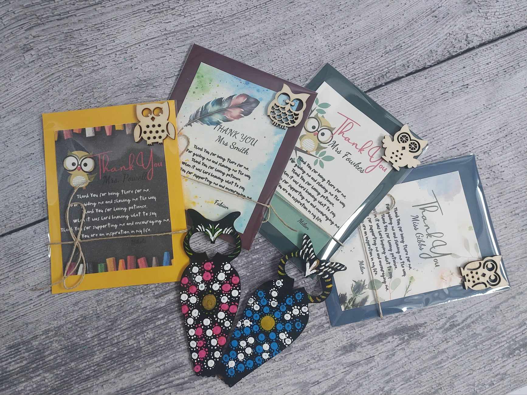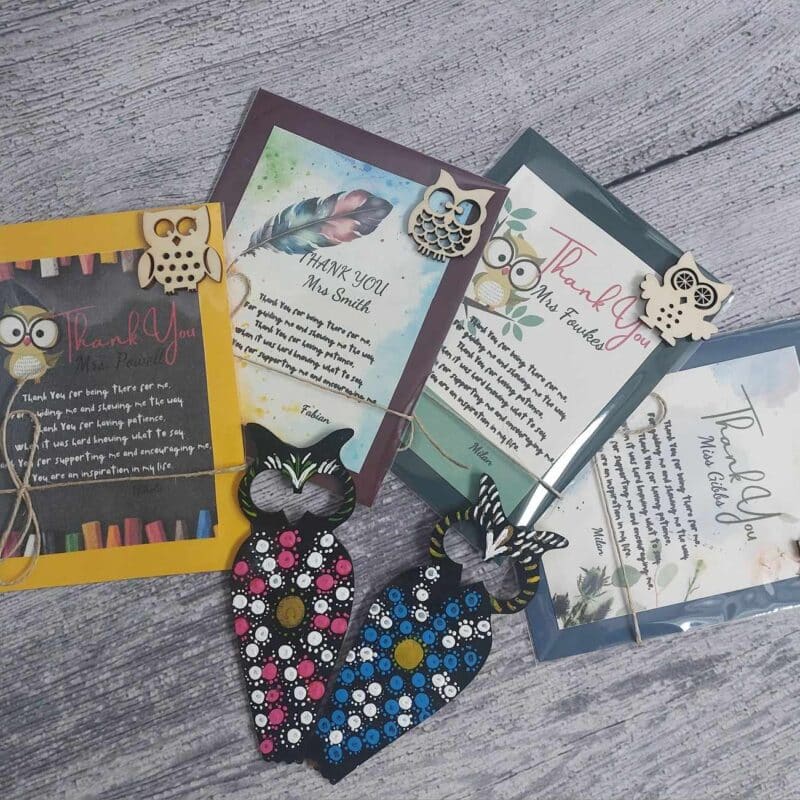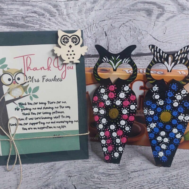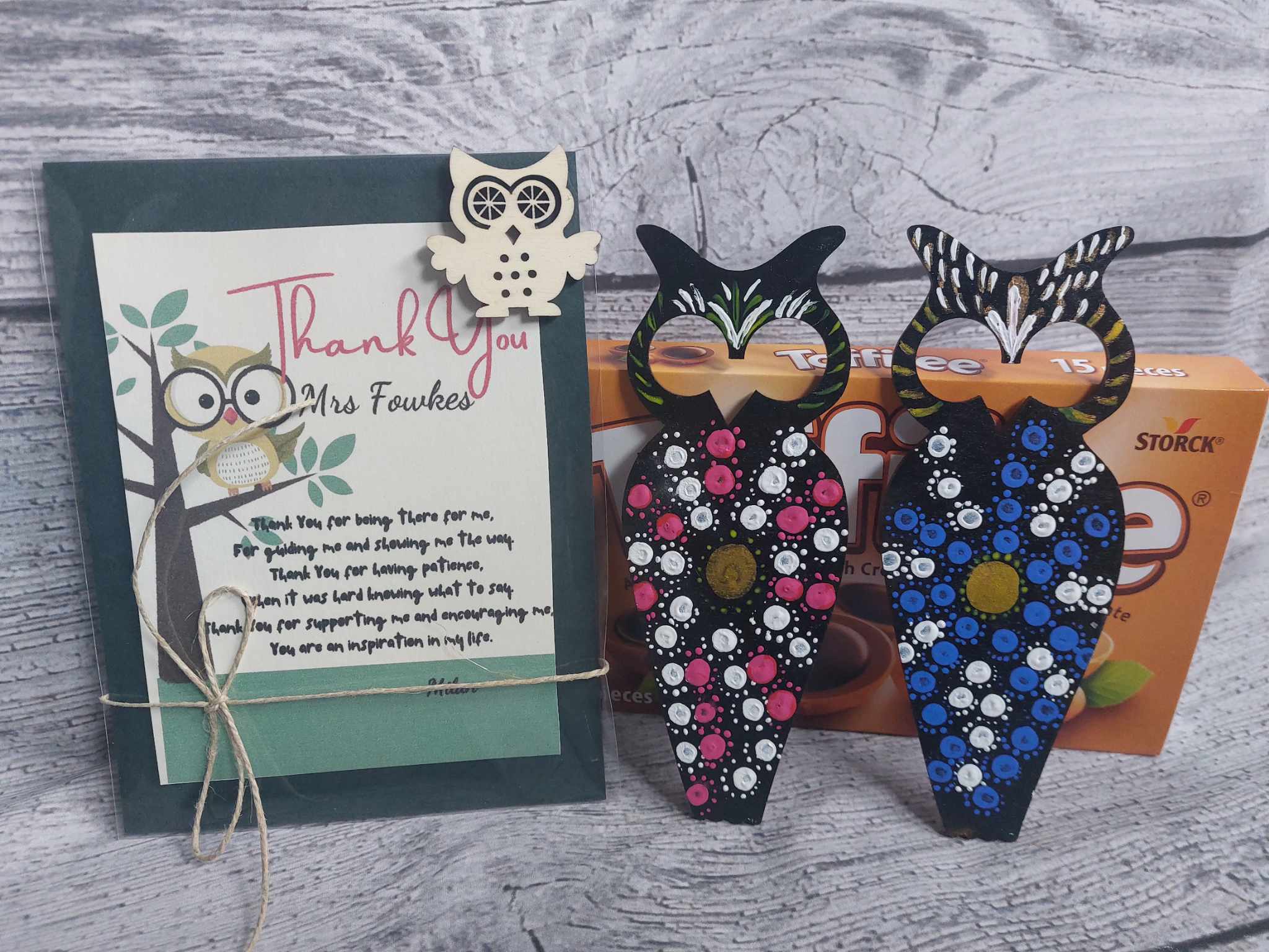Luxury Personalized Thank you gift set for teachers *Card +Hand Painted wooden Bookmark Owl+ Toffifee / Cadbury Milk Tray