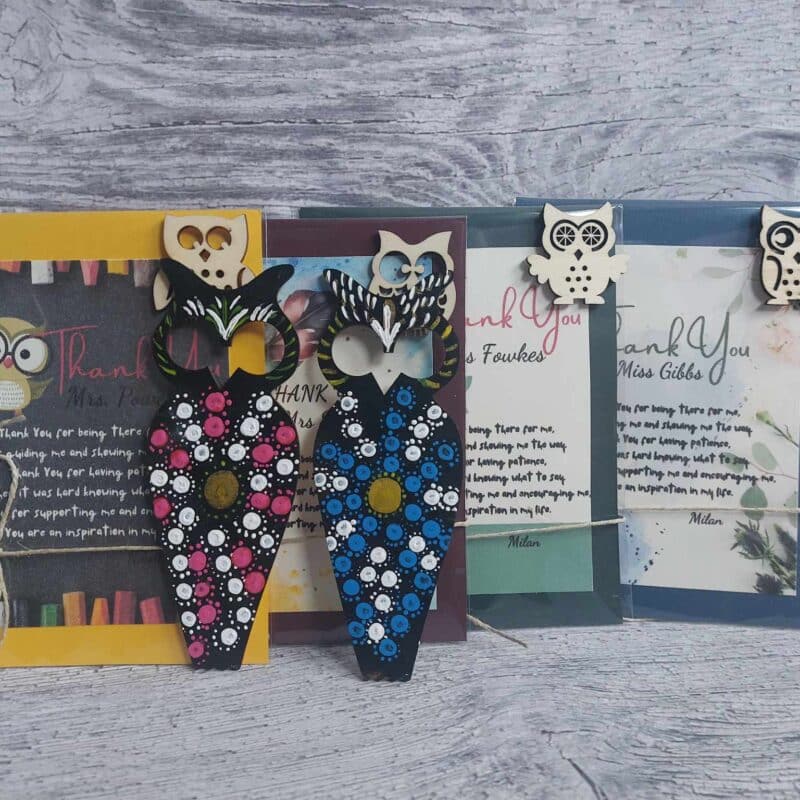 🌿Little wooden owl + Thank you teacher sticker added on the front.