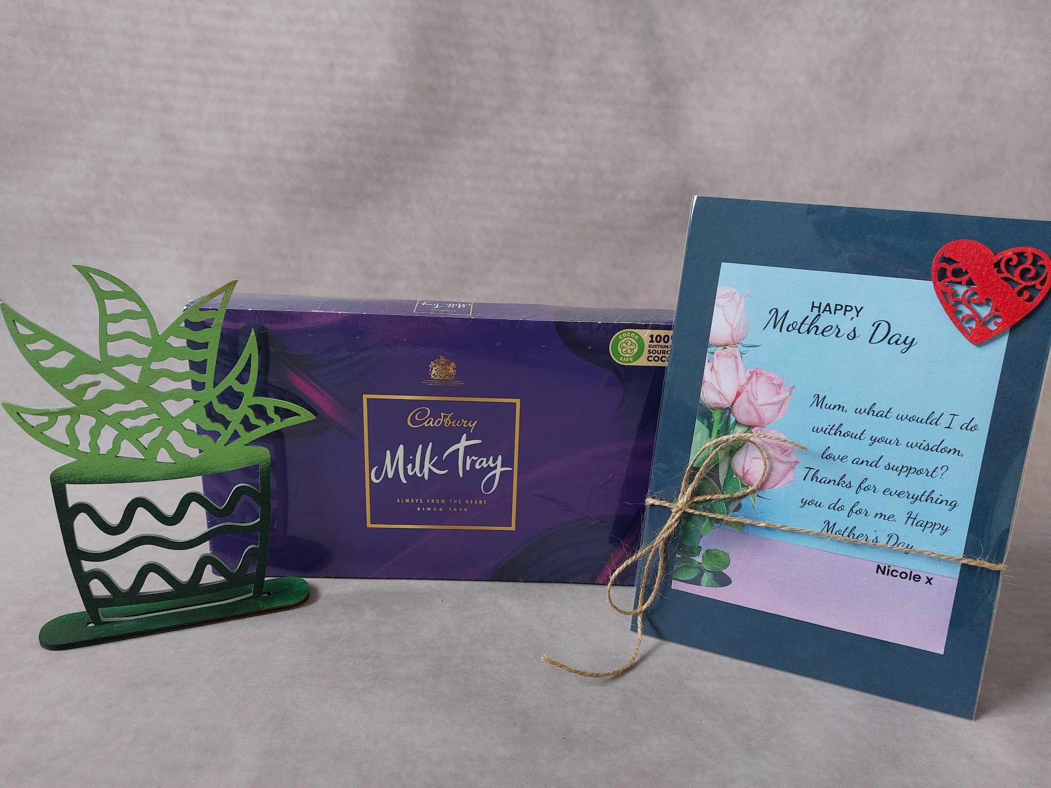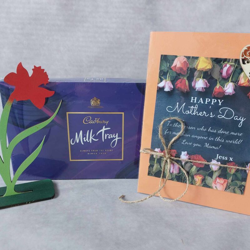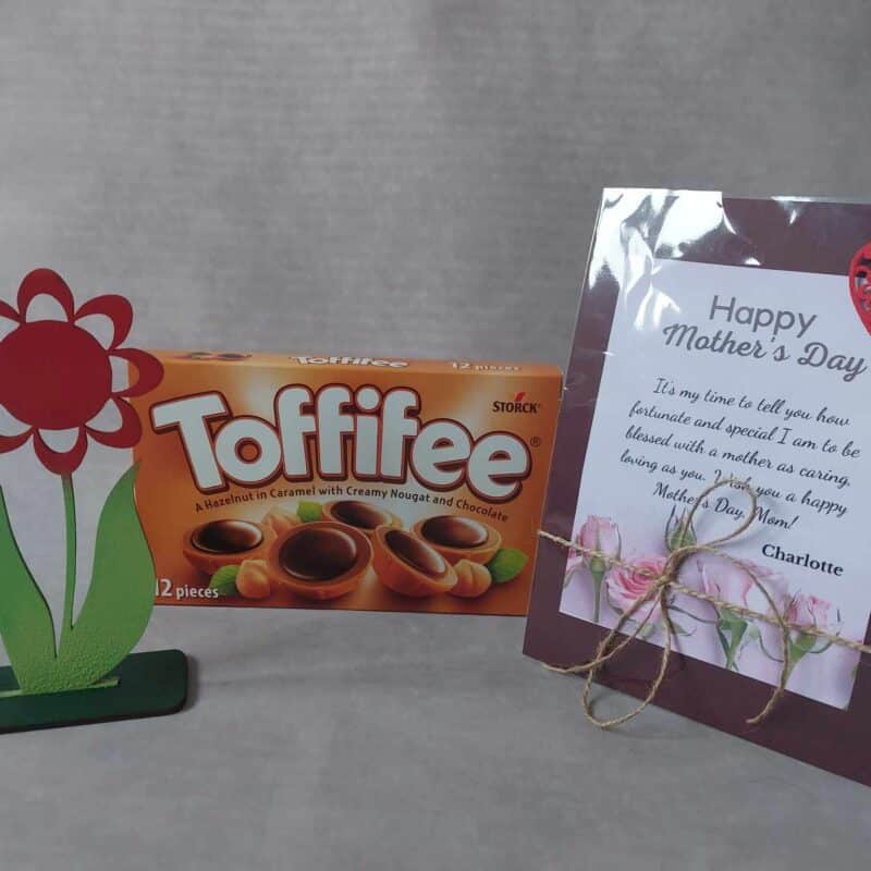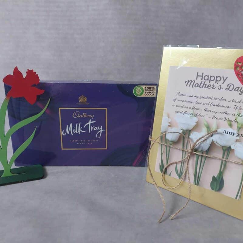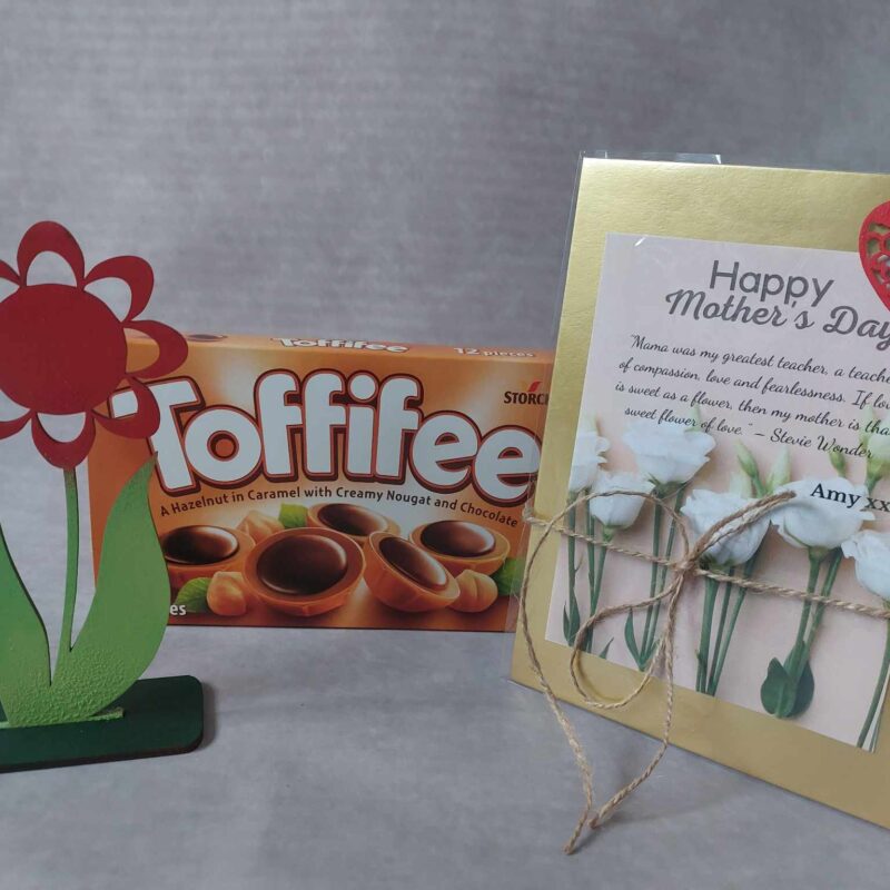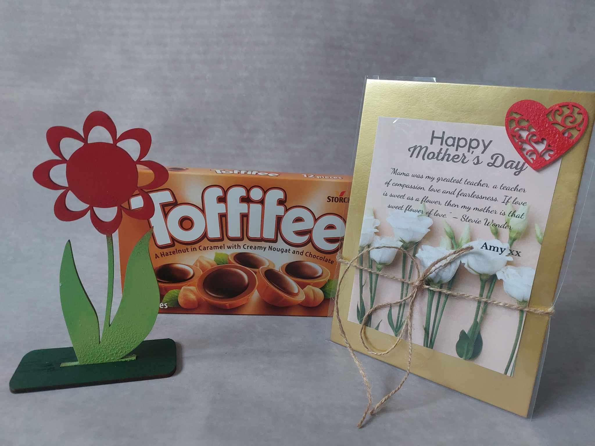 Luxury Personalized Mother’s Day gift set *Card + Wooden Flower Stand + Cadbury Milk Tray / Toffifee