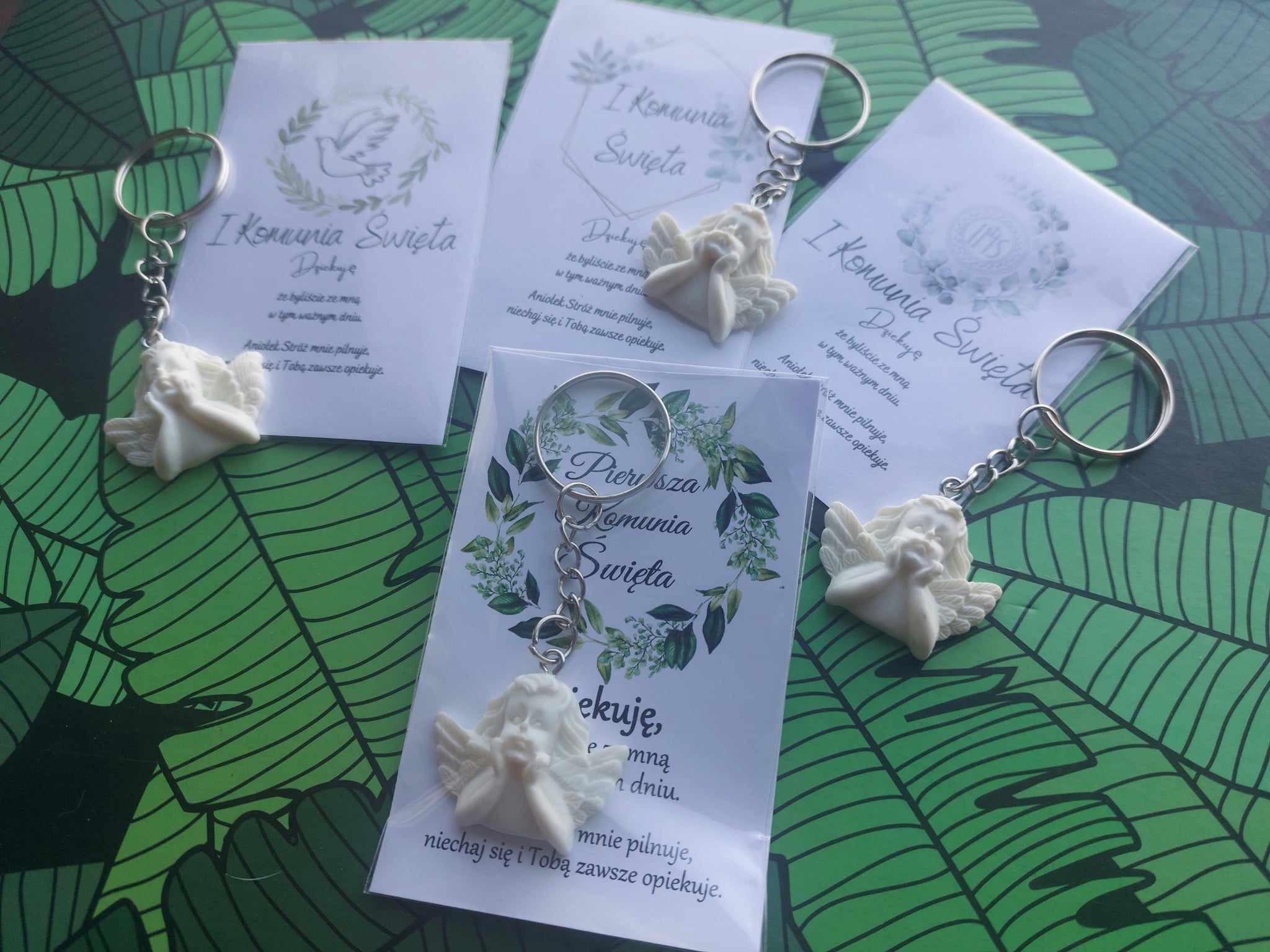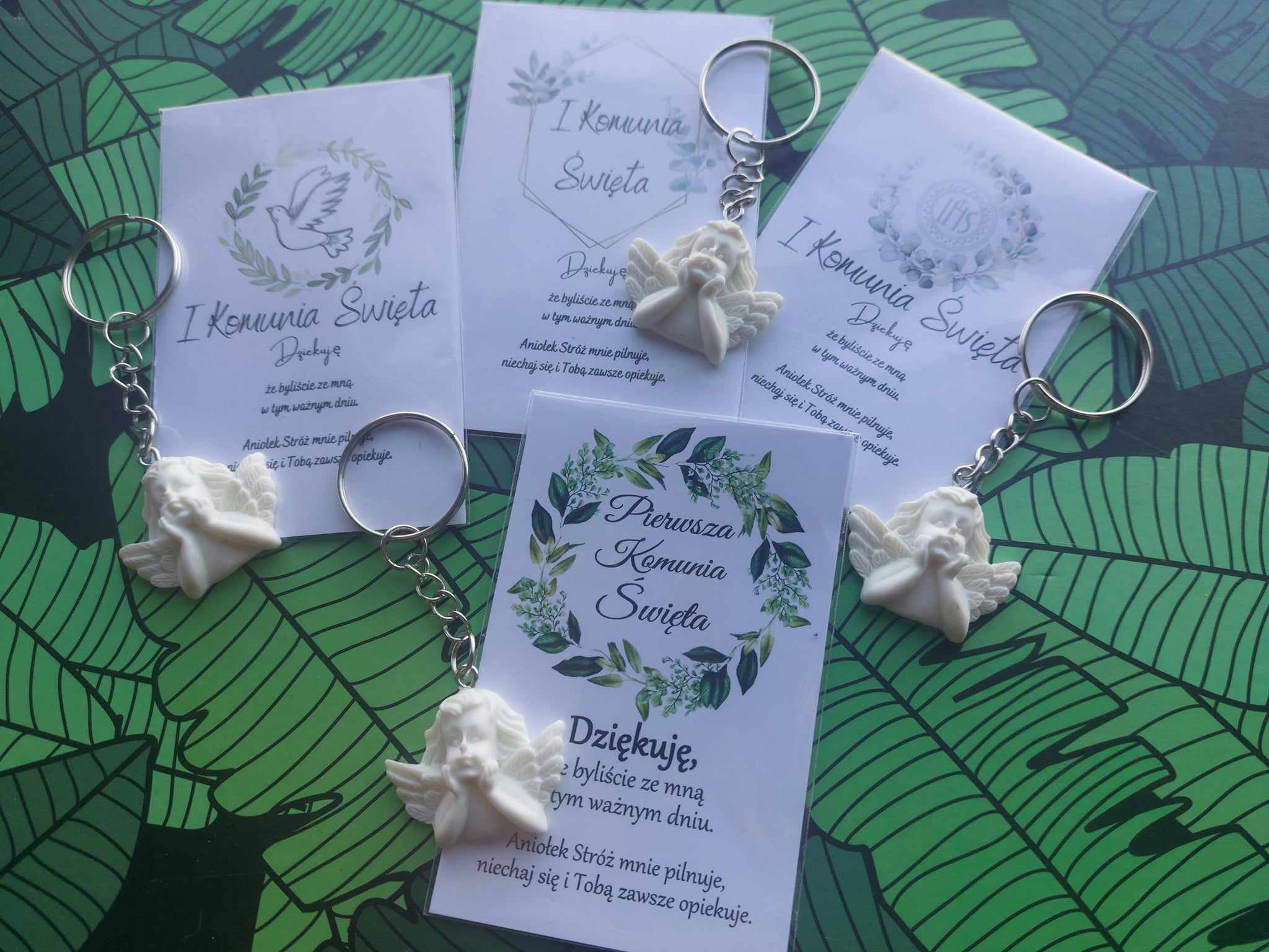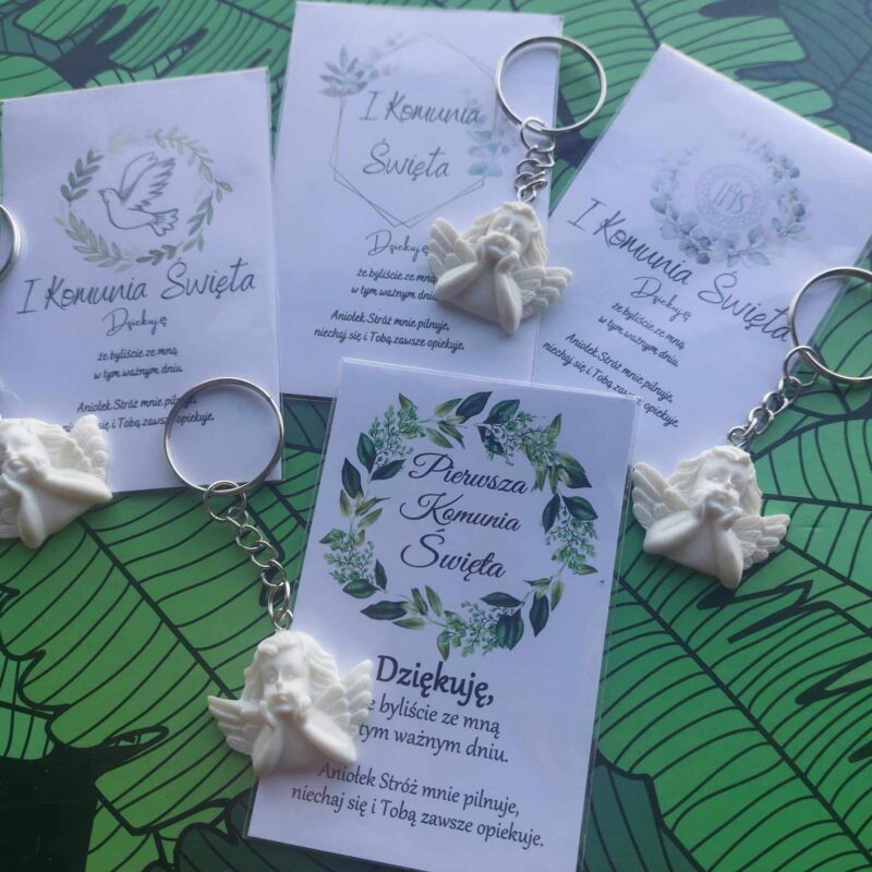 POLISH VERSION Thank you gift for guests 1st Holy Communion – card & resin angel keyring