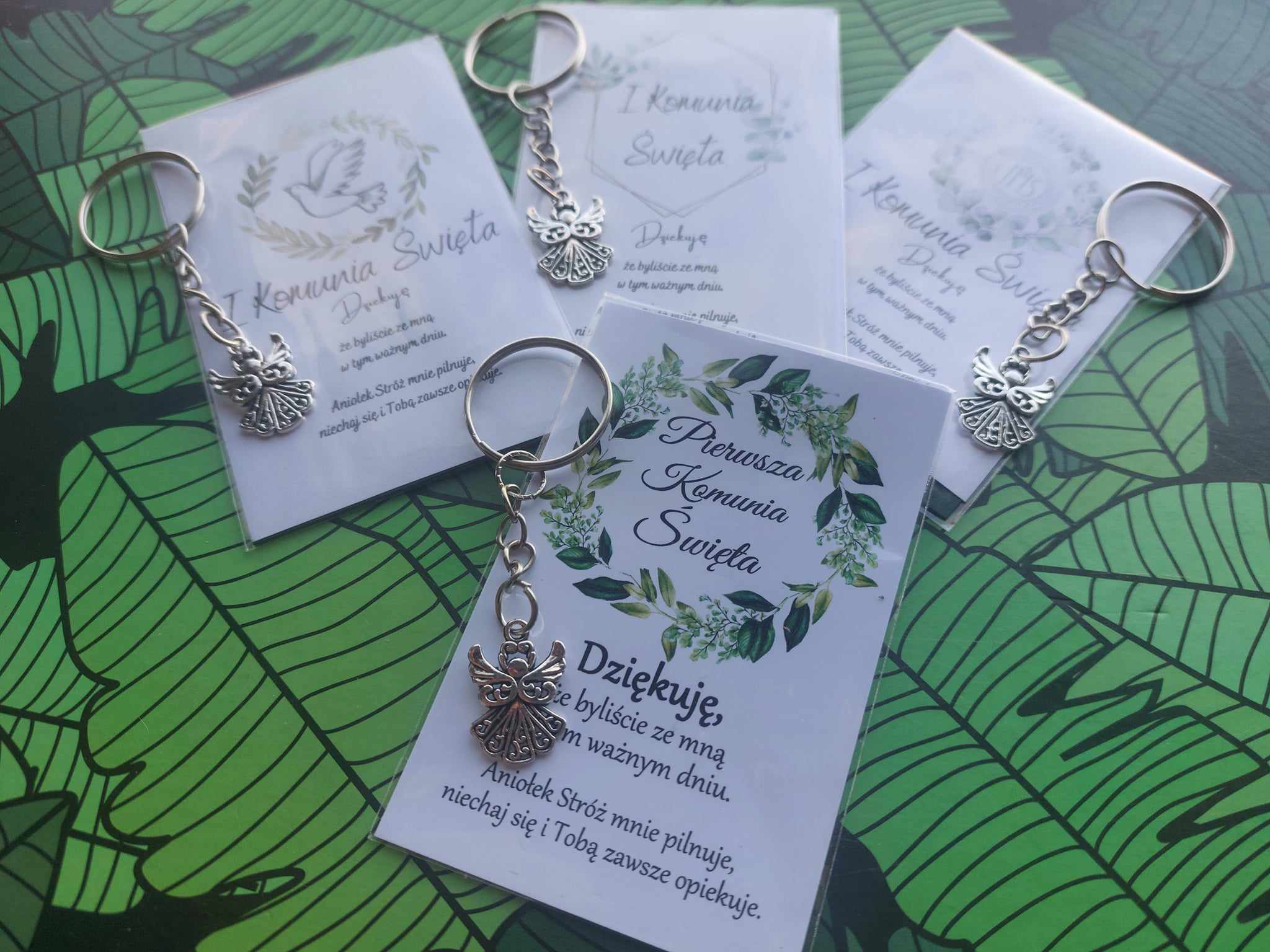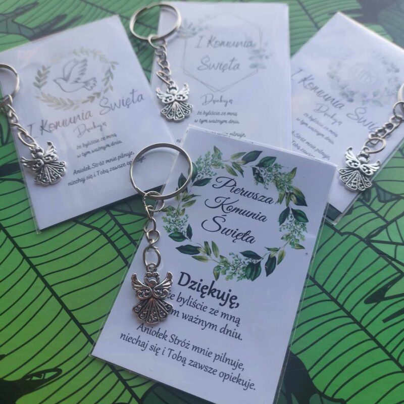 POLISH VERSION Thank you gift for guests 1st Holy Communion – card & stainless steel angel keyring