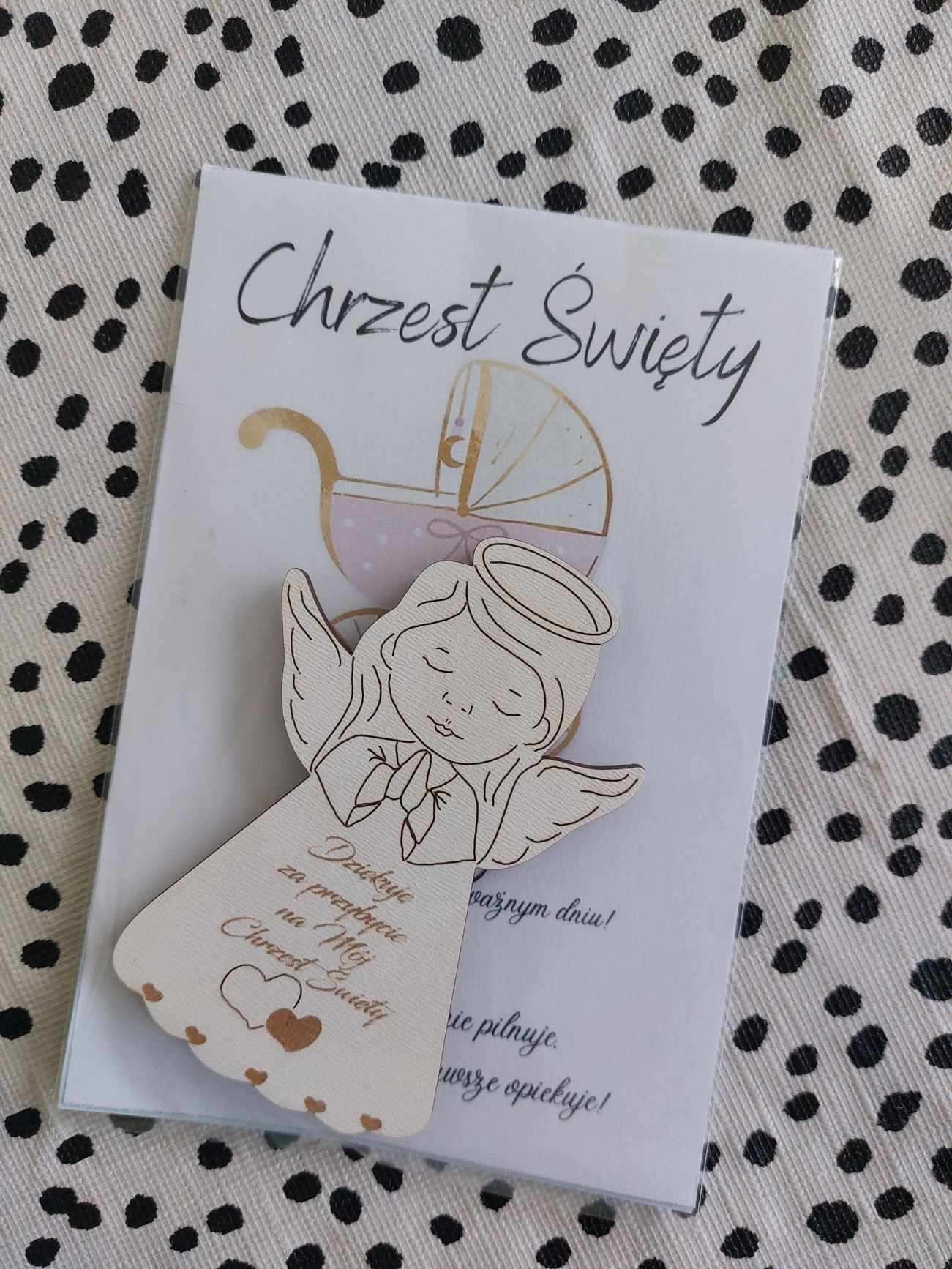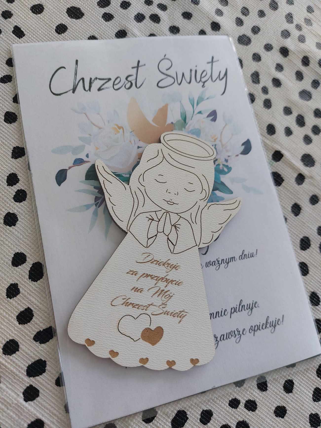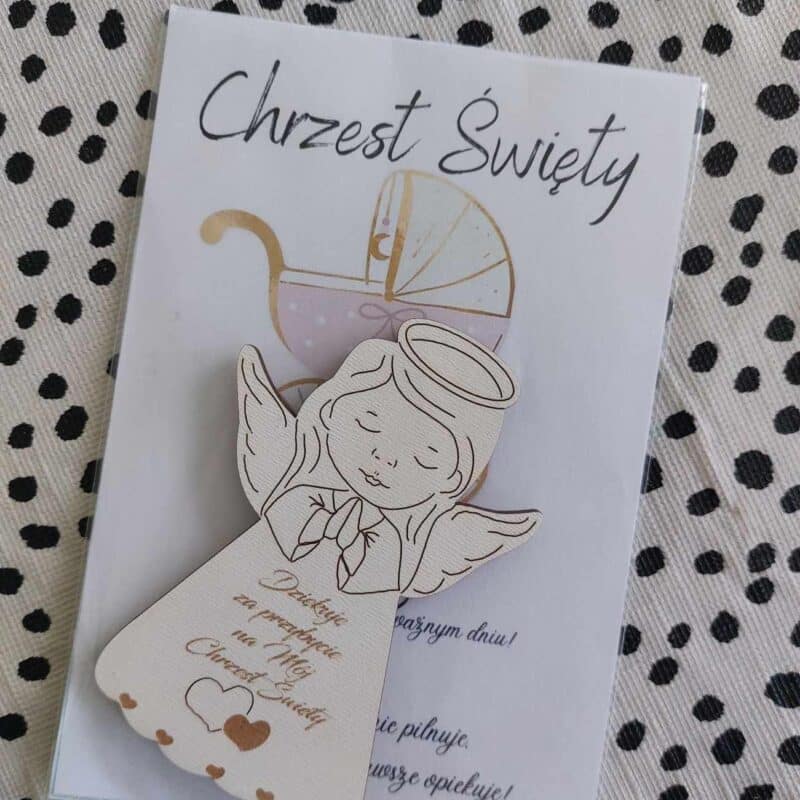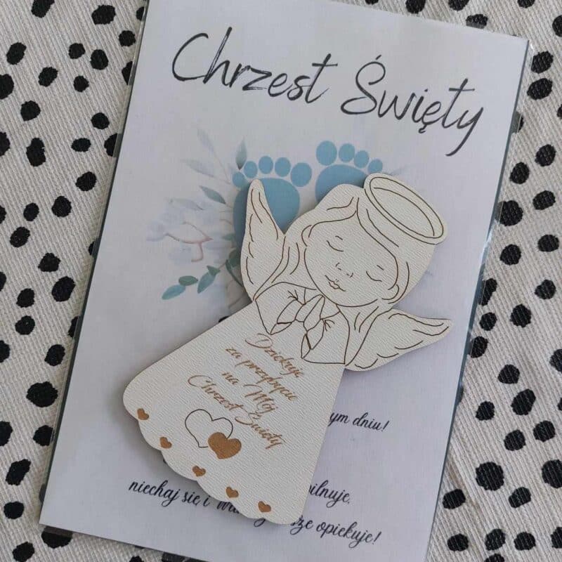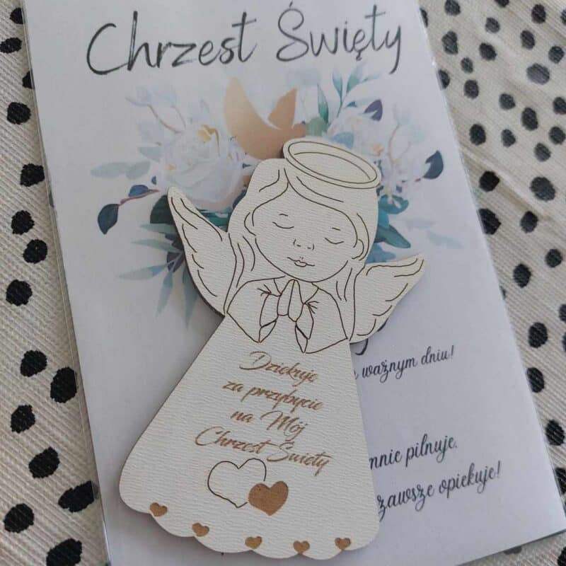 POLISH VERSION Thank you gift for guests Baptism – card & wooden angel large magnet