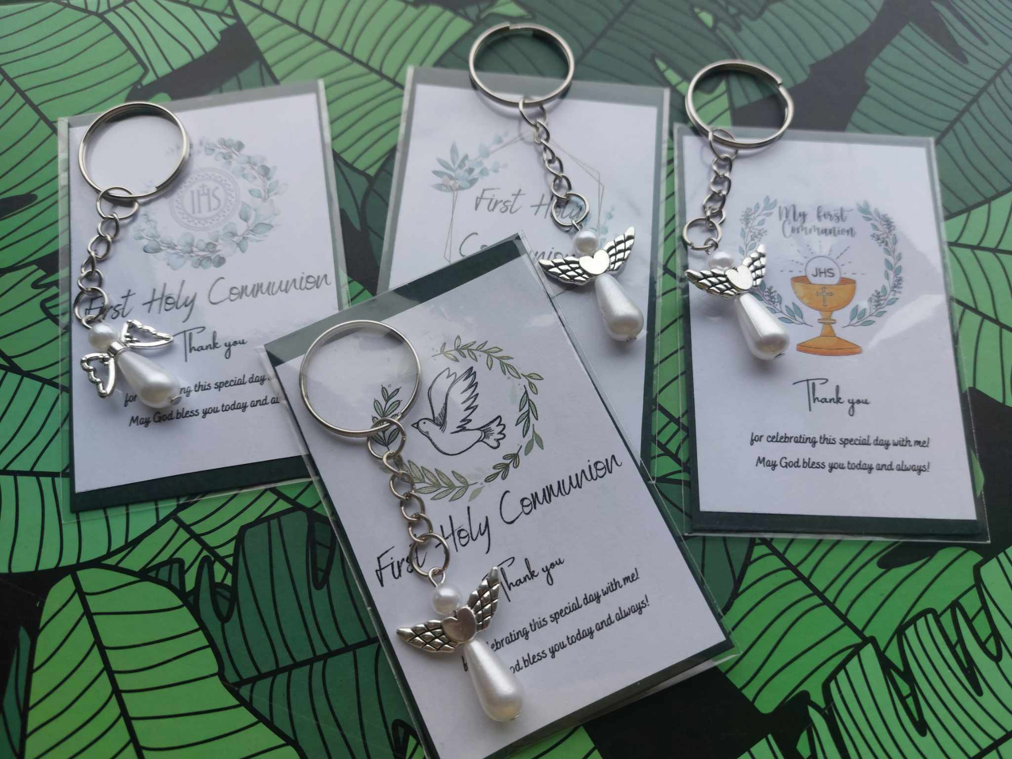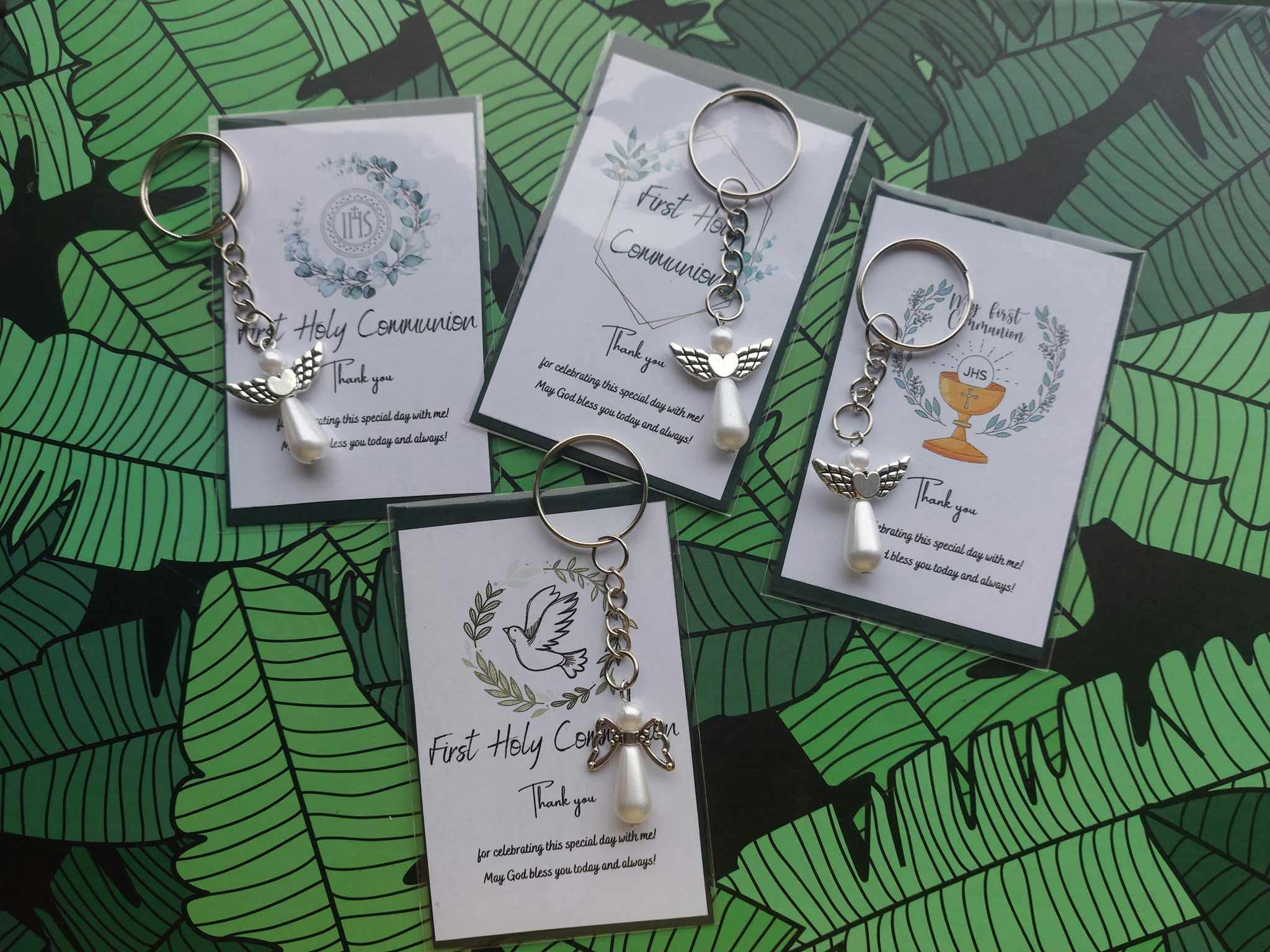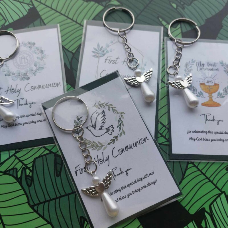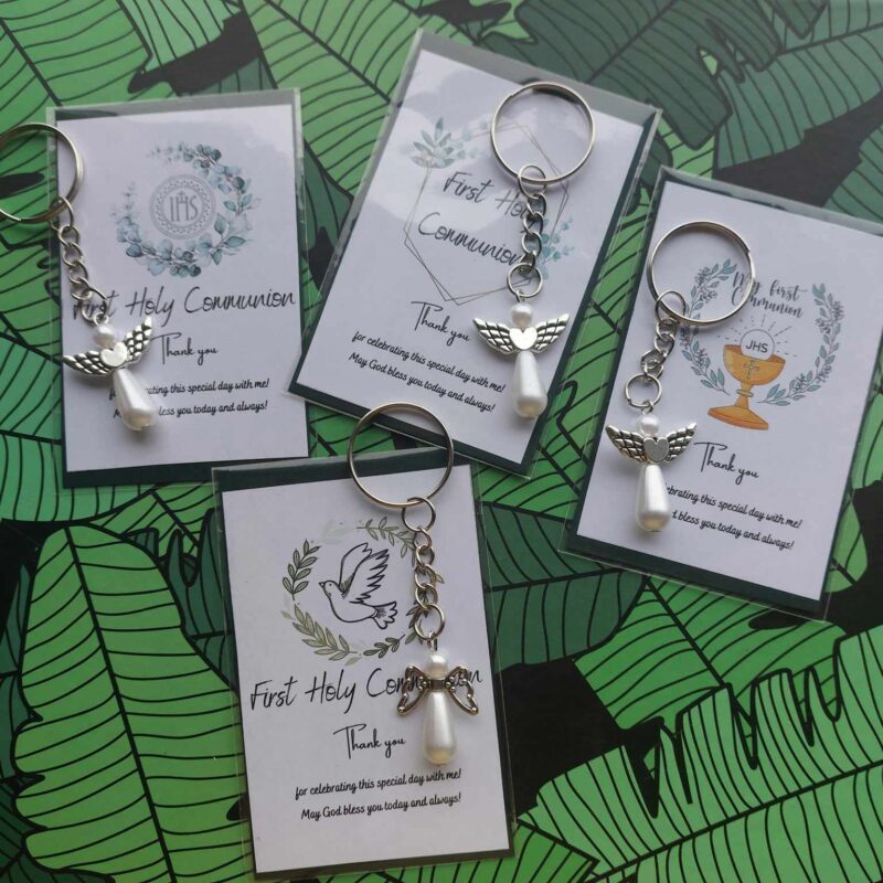 Thank you gift for guests 1st Holy Communion – card & stainless steel angel with pearl keyring