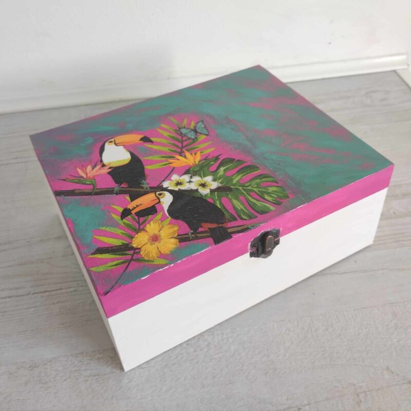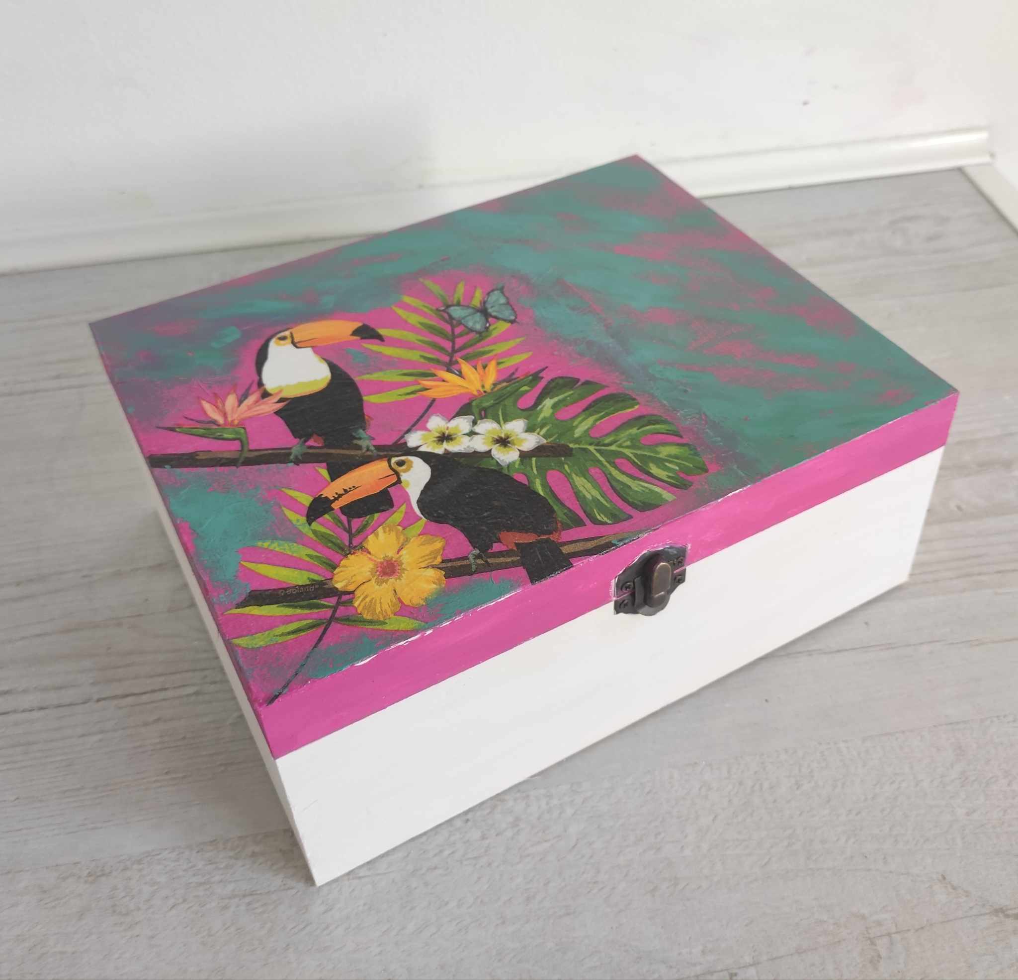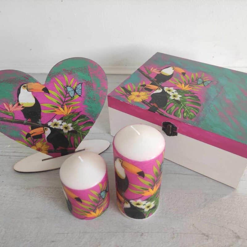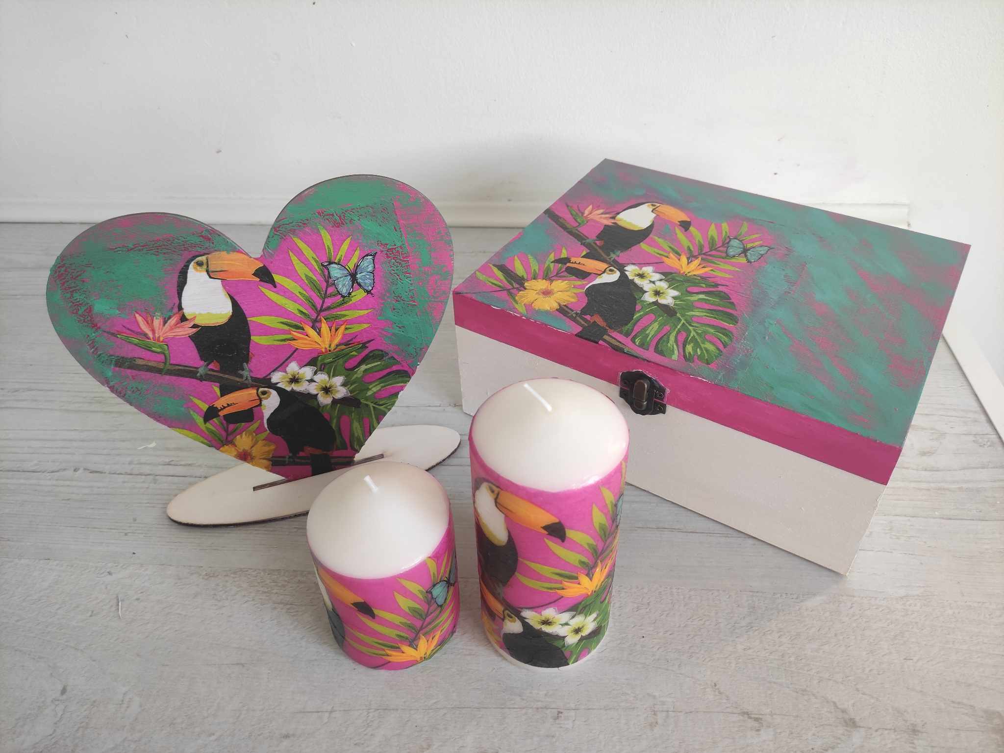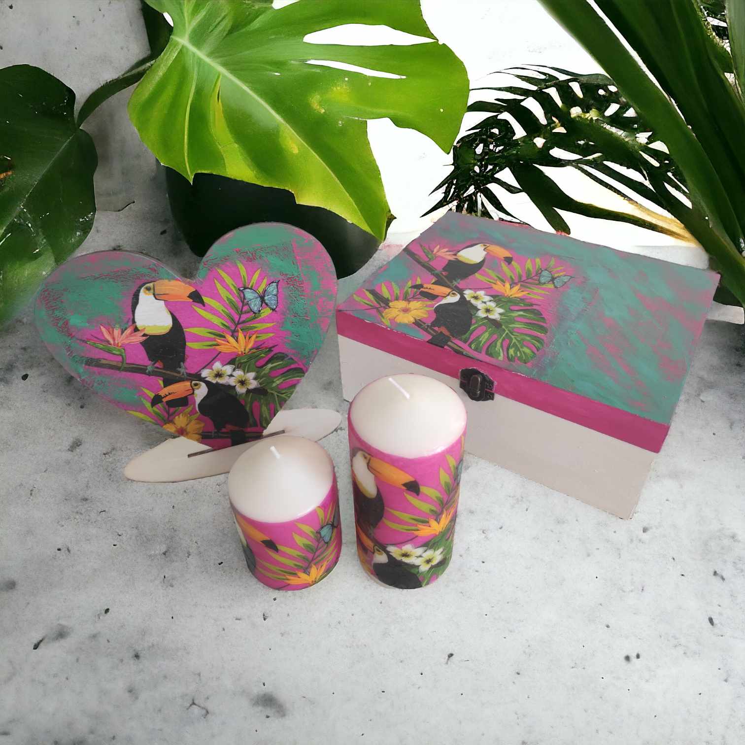 🌿Toucans colourful wooden storage box-keepsake & candles gift set & wooden stand heart